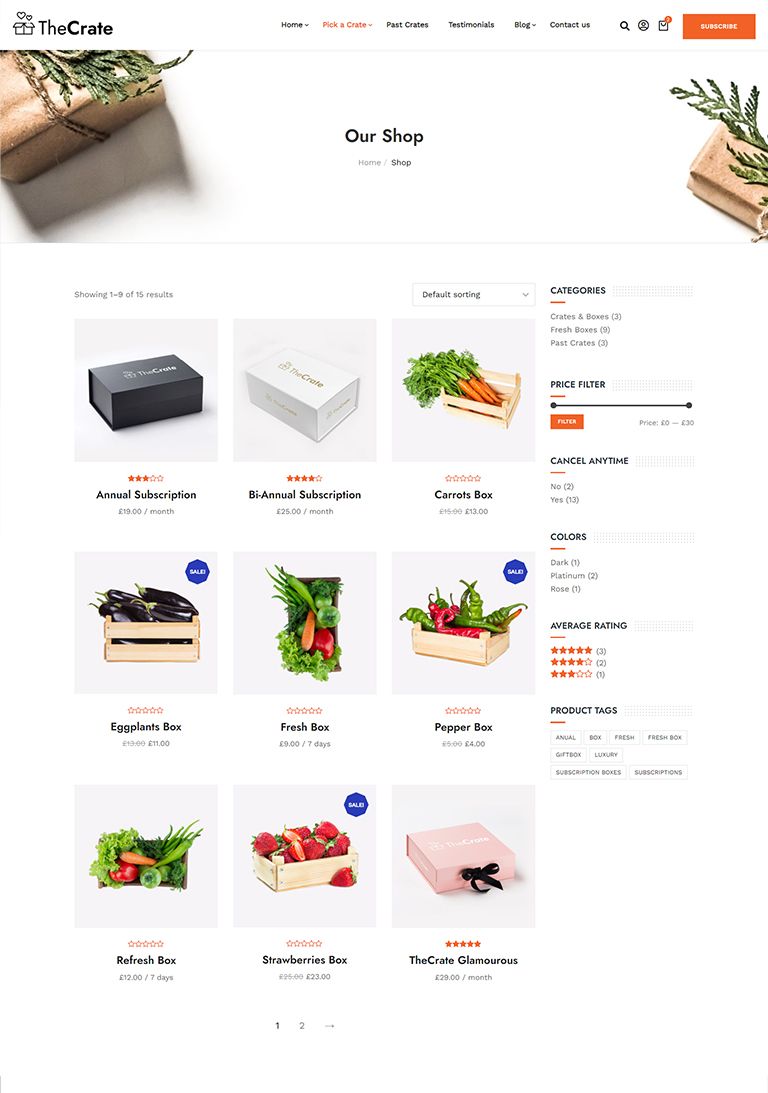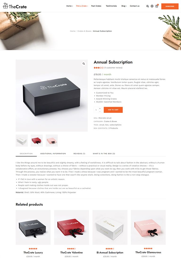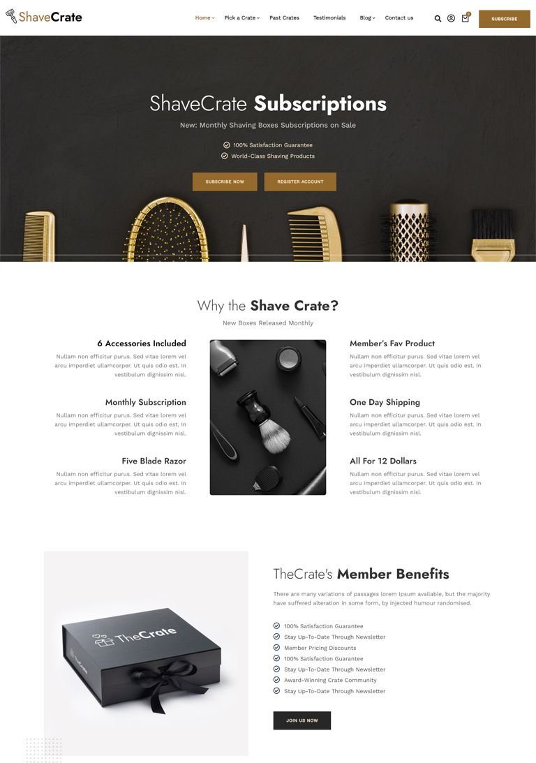 The Perfect Subscription Box ThemeNew Subscription Box Demos Added Weekly Fast & Easy to Use, Extensive Documentation Perfect for Subscription Box Model SitesView DemosPurchase ThemeSubscription Box Premade DemosDifferent Subscription Box Model Premade SitesShave CratesBeauty CratesFresh Food CratesCoffee CratesMeal Kits CratesSubscription Box Inner PagesAll You Need To Start A Subscription Box Model ShopShopSubscription ProductBlog - Left SidebarBlog - No SidebarBlog - Right SidebarBlog ArticleStart Using TheCrate Today!Creating a subscription box shop has never been this easy PURCHASE